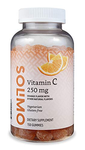 Solimo Vitamin C gummies feature sour orange flavor with other natural flavors. They are vegetarian and gluten-free. Adults – chew two day-to-day.