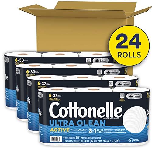24 FAMILY MEGA ROLLS: Cottonelle Ultra Clean Toilet Paper with Active CleaningRipples Texture, 24 Circle of relatives Mega Rolls (4 packs of 6); 388 sheets per roll.