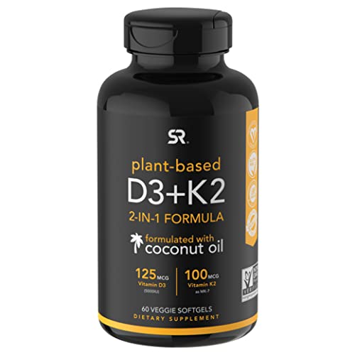 Sports Research Vegan Vitamin D3 + K2 Supplement with Organic Coconut Oil – 5000iu Vitamin D with 100mcg Mk7 Vitamin K…